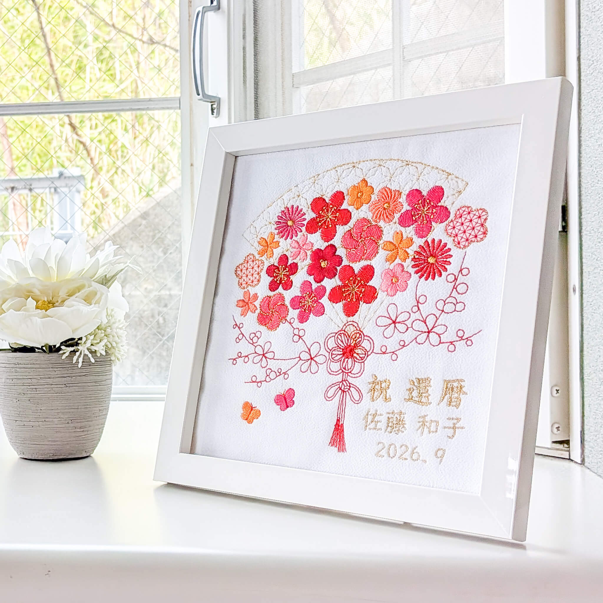 8色の糸でお花を刺繍した長寿祝い記念品、名入れギフトです。