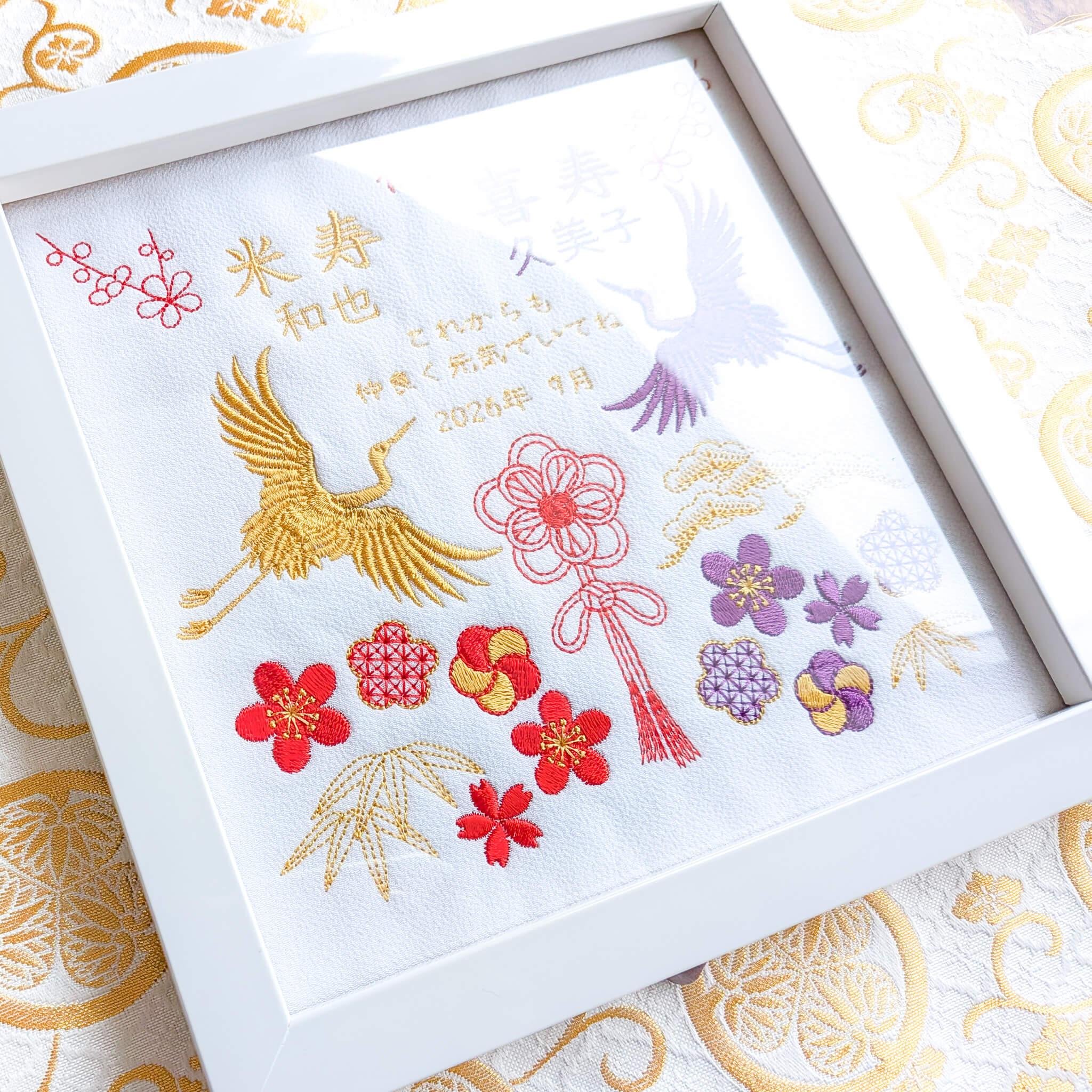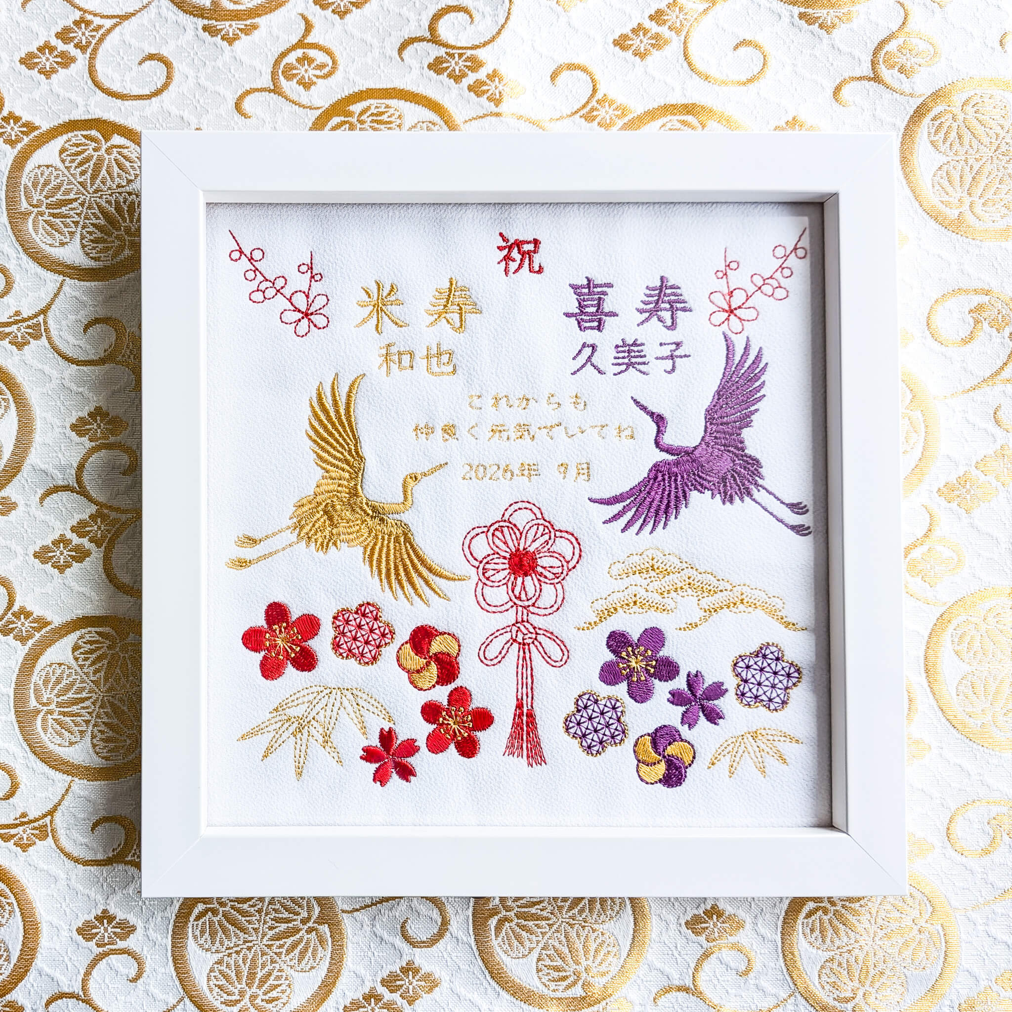 お祝いする2羽の舞鶴と縁起物の松竹梅を刺繍した長寿祝い記念品