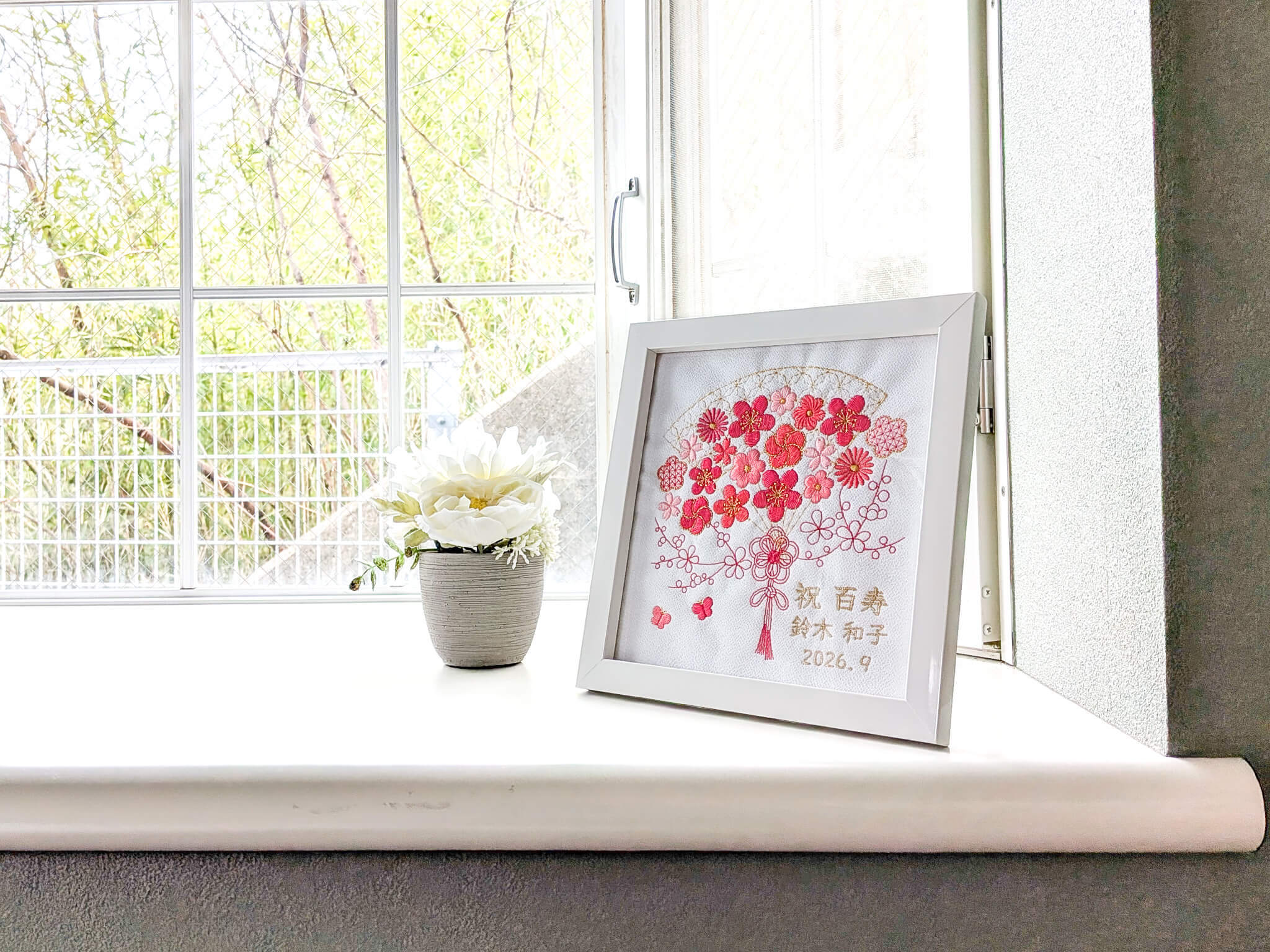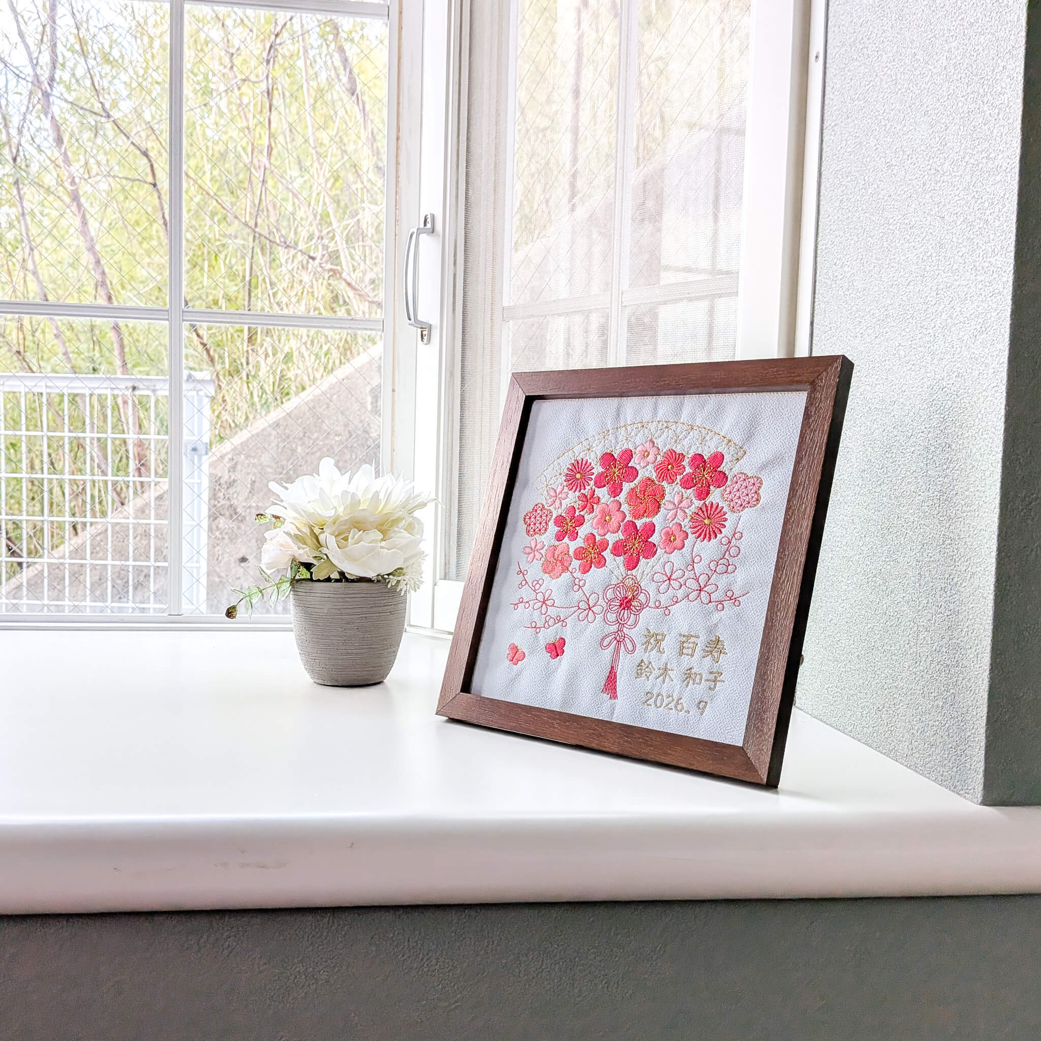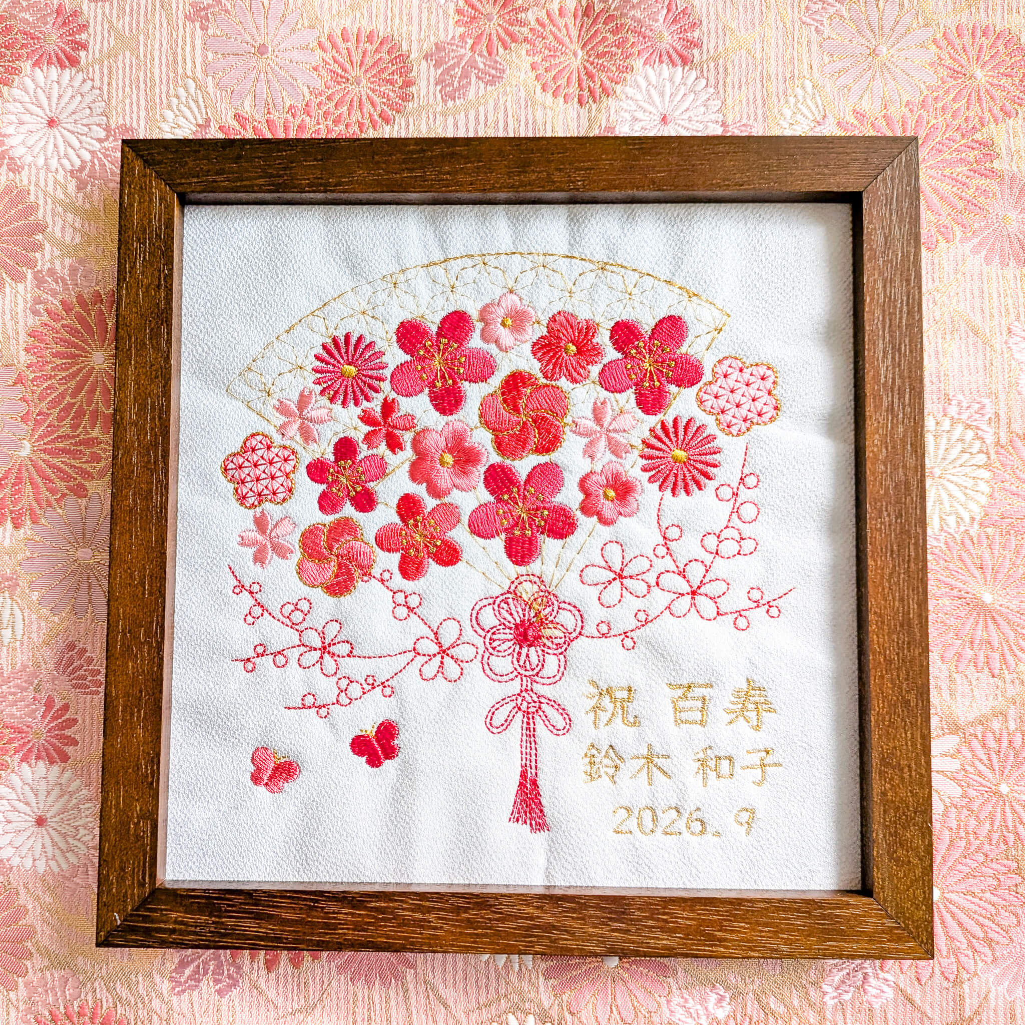 5色の糸でお花を刺繍した長寿祝い記念品、名入れギフトです。