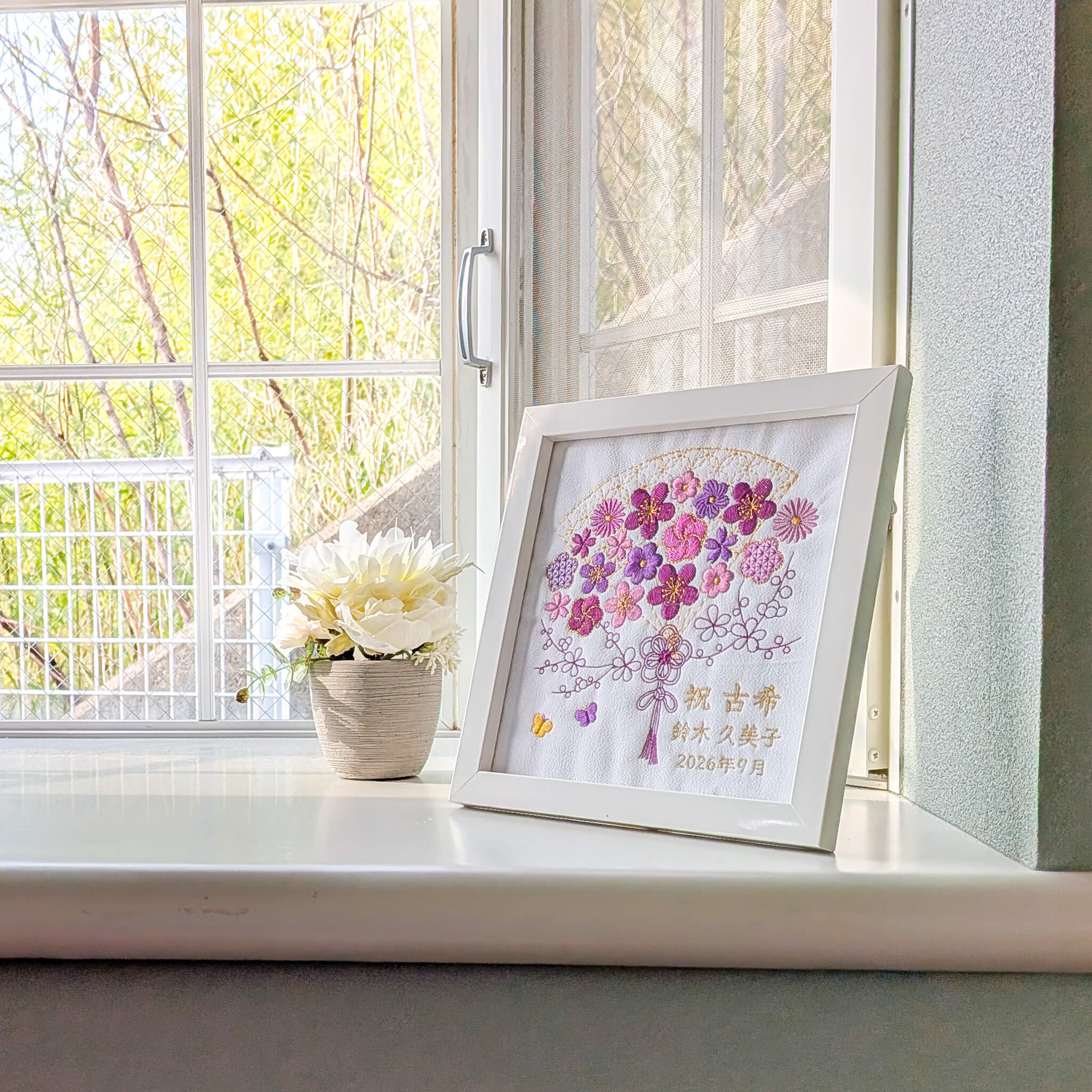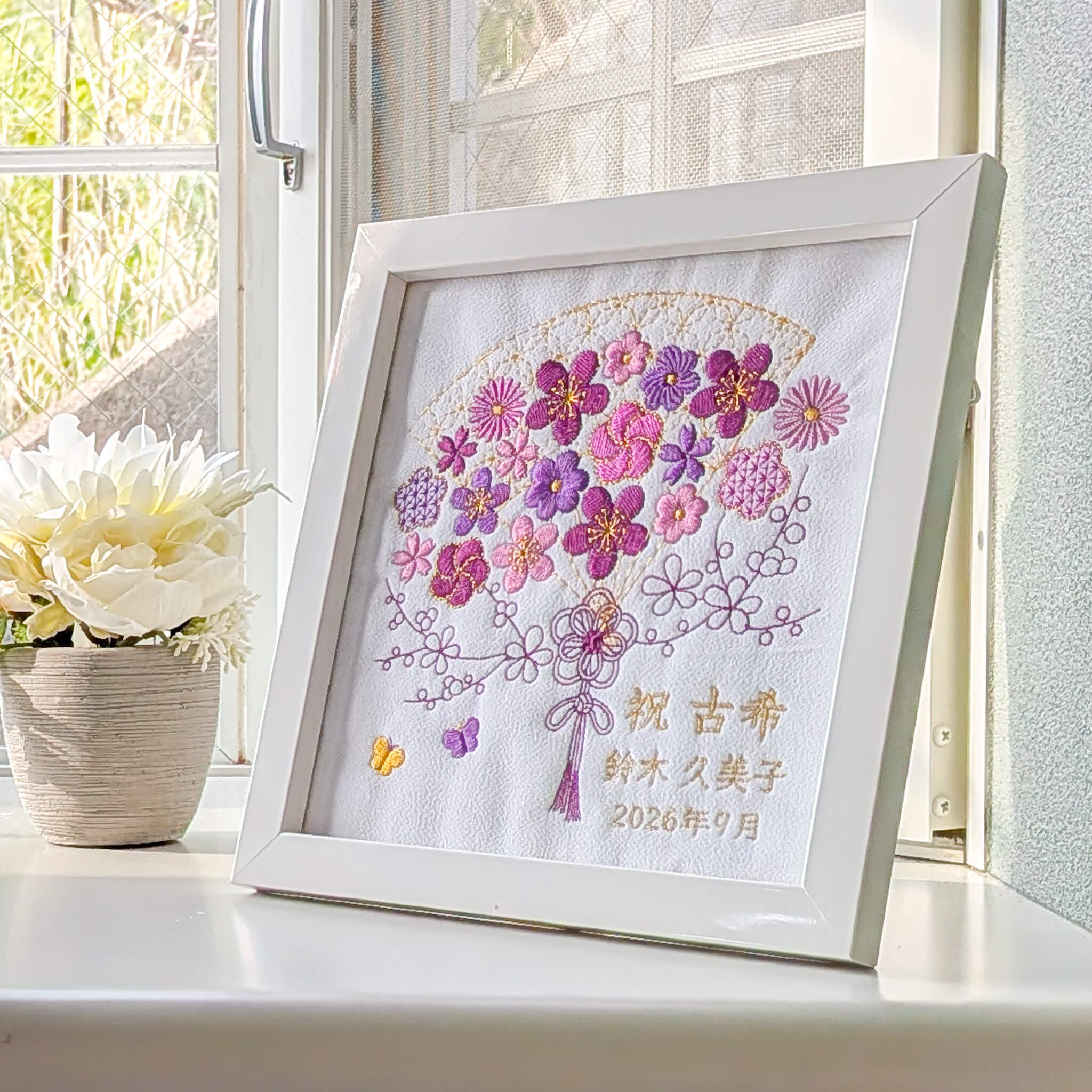 5色の糸でお花を刺繍した長寿祝い記念品、名入れギフトです。