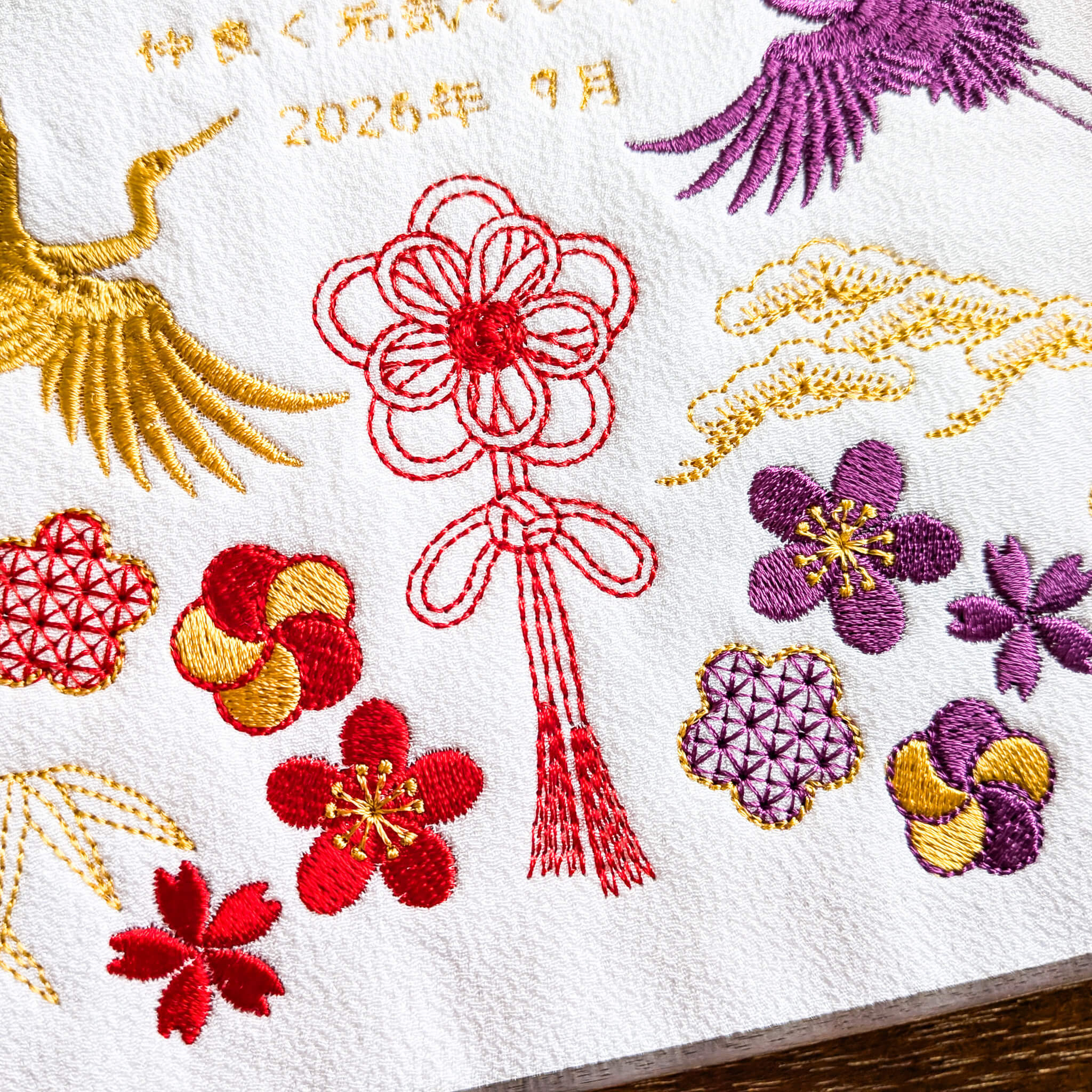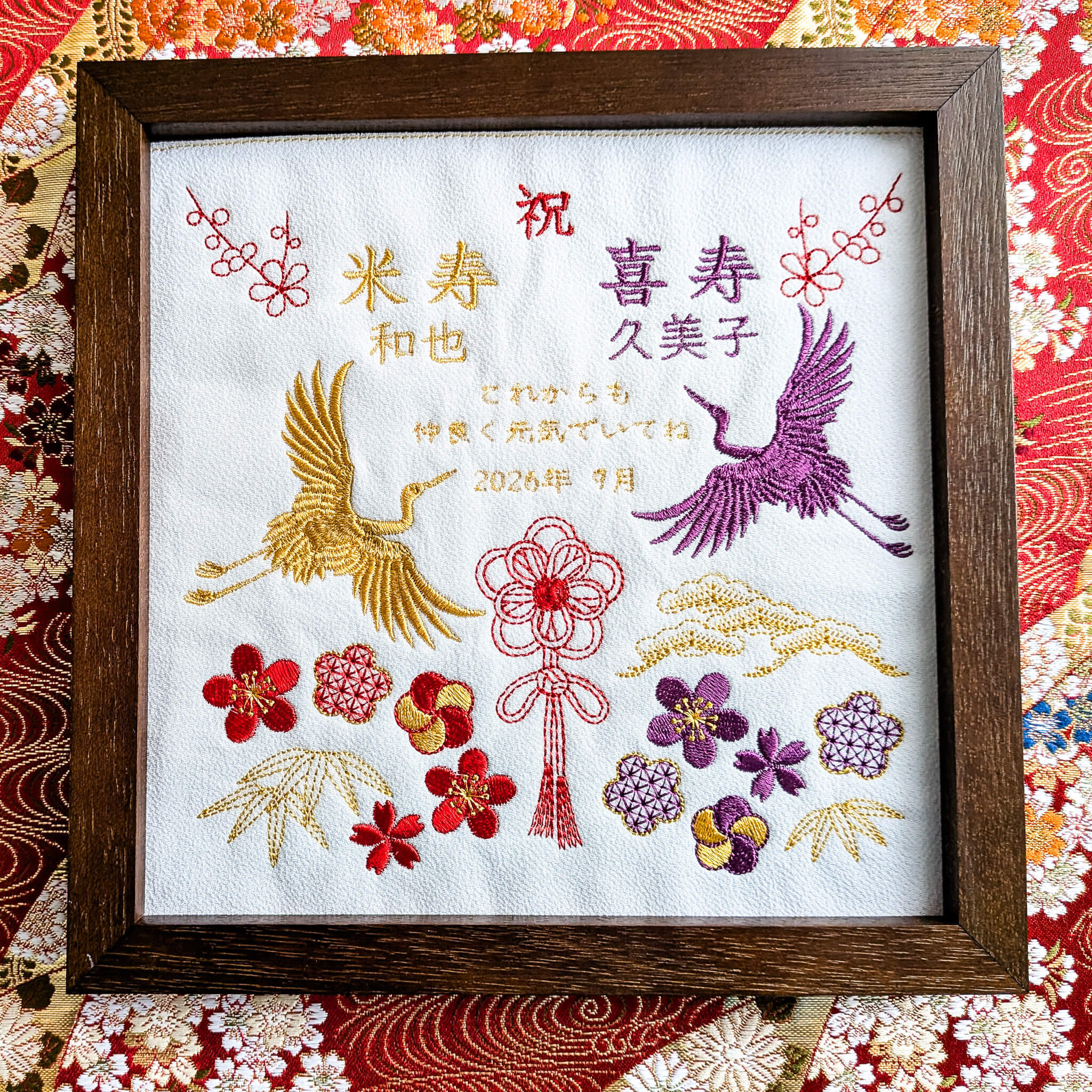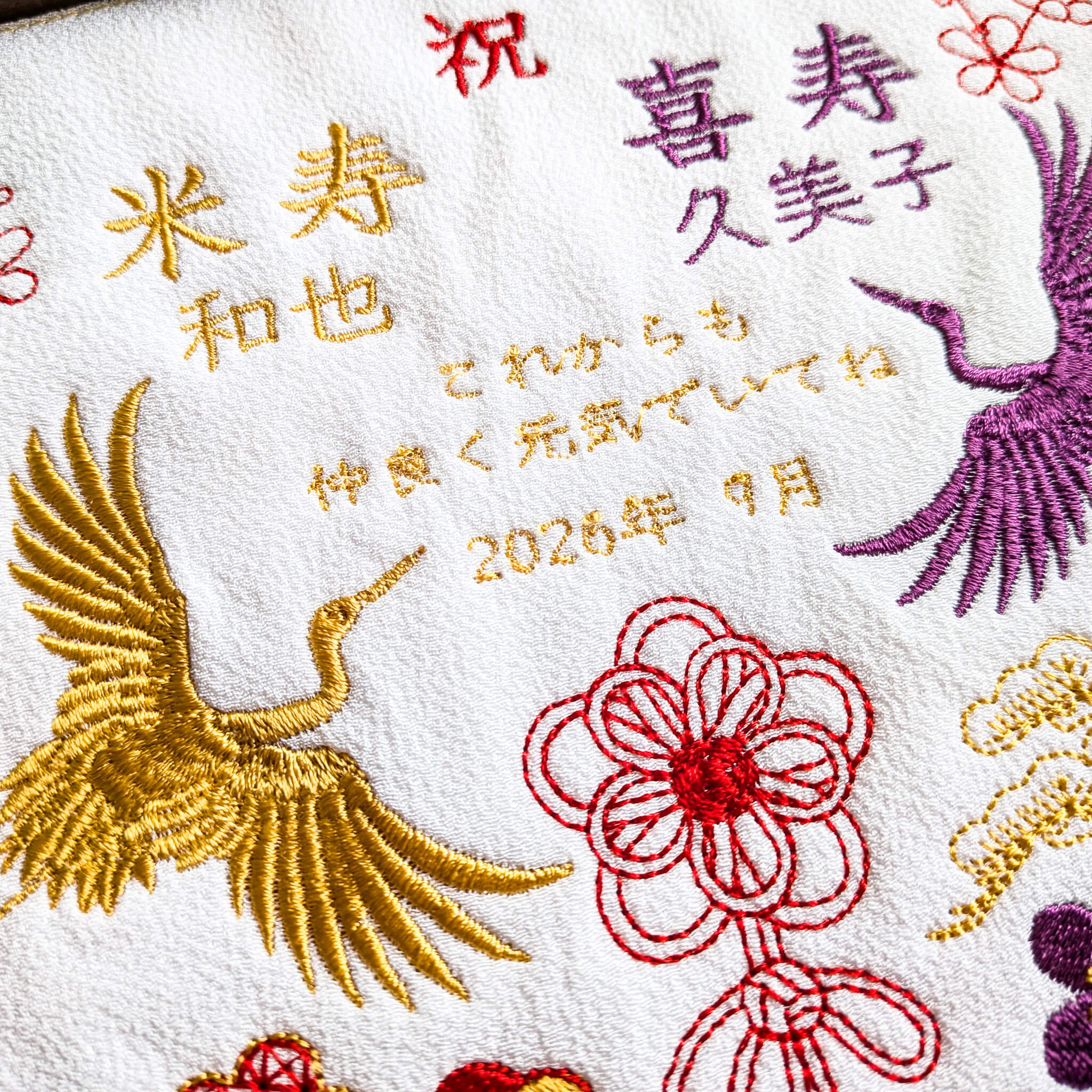 お祝いする2羽の舞鶴と縁起物の松竹梅を刺繍した長寿祝い記念品